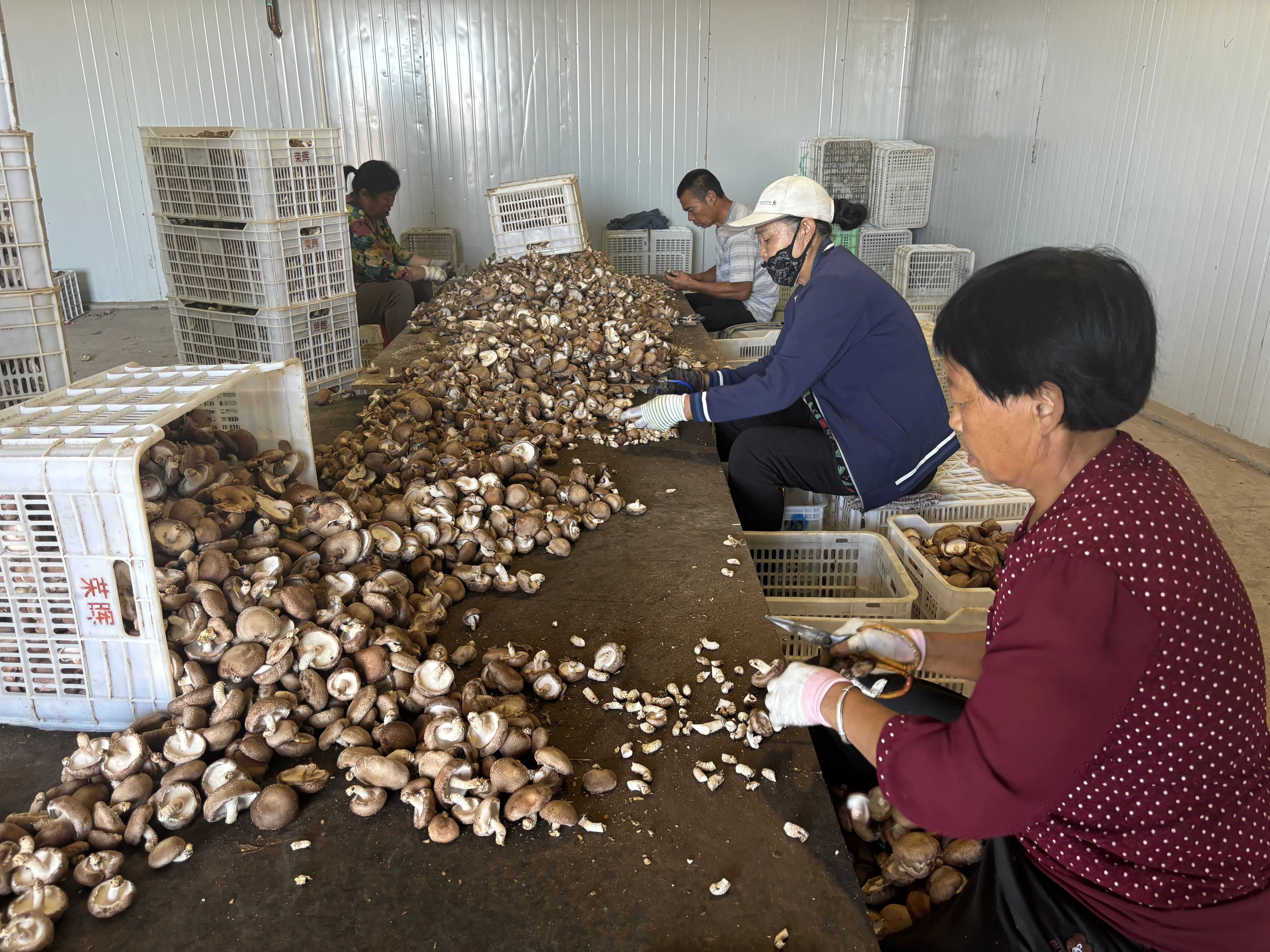 走进种植大棚,40余名采收工人穿梭在菌棒之间,小心翼翼地将成熟的菌菇摘下,动作娴熟又轻柔;基地每日产量达1万斤,全年总产量突破200万斤,创造产值约800万元。香菇加工车间里,20名工人专注进行剪根作业,只为保证每朵香菇的形态与口感俱佳——按每筐3元的计件薪酬计算,熟练工人一天能完成40筐,日收入稳定在120元。不仅如此,菌种研发、菌棒制作等产业链环节还带动大量就业,仅万家菌业就已吸纳超120人稳定就业,帮助农户月增收超3000元,真正实现“产业兴则就业稳,就业稳则收入增”。