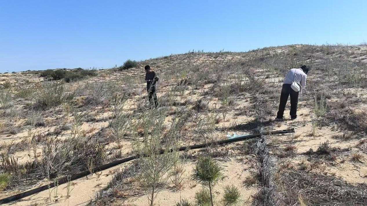 验收组实地查看960亩工程固沙项目,并对栽植的固沙柠条成活率进行验收,经验收2025年工程固沙项目植被成活率为80%-90%,远高于成活率75%以上的标准,防风固沙成效显著。随后验收组到退化林分改造项目开展验收,2025年春该地块栽植山杏、榆树等乔木4000余株,经过一年的生长,树木成活率已达90%以上,远高于验收标准。
