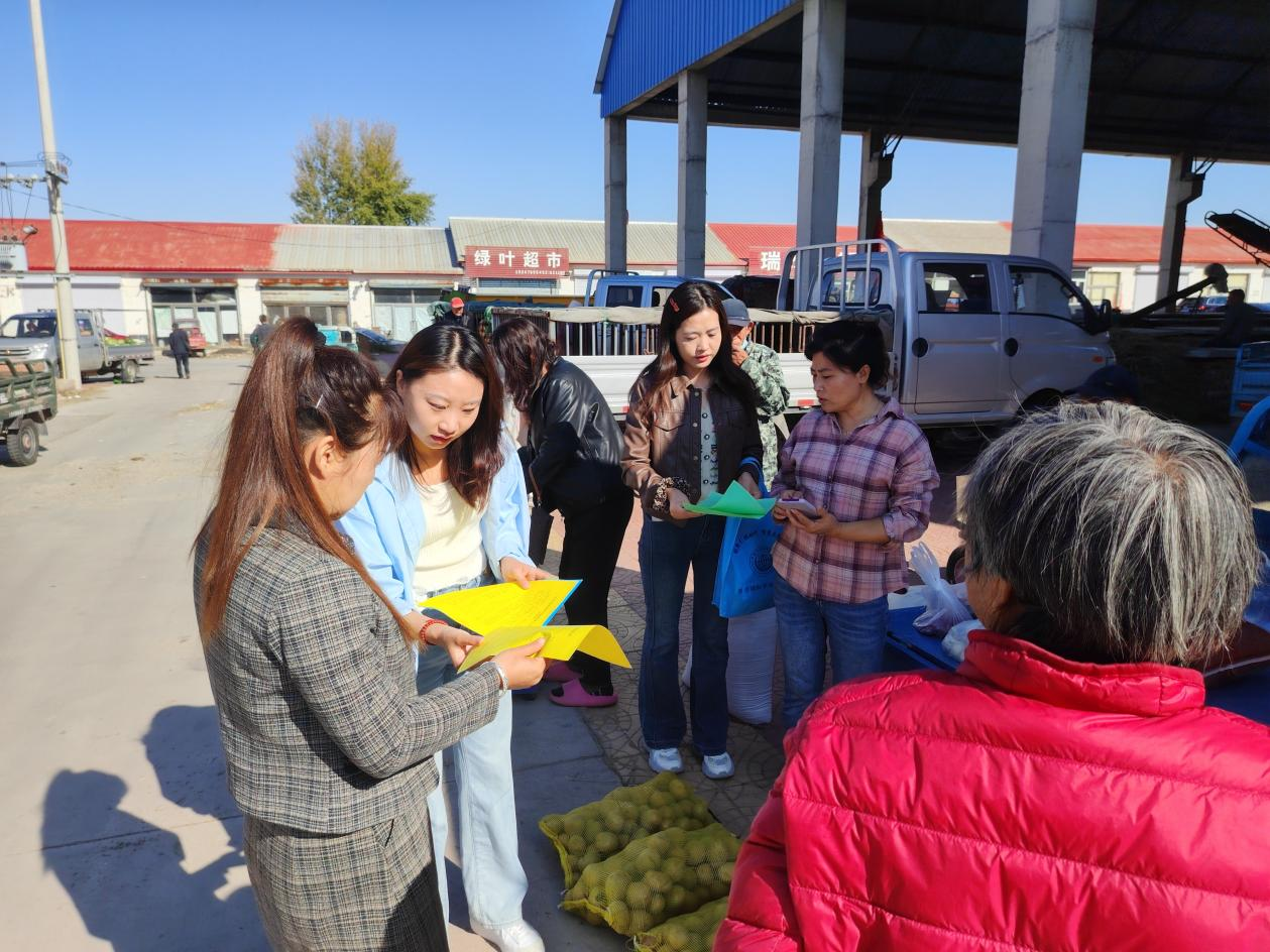 工作人员给商户发放宣传单。(摄影:李玉雷)