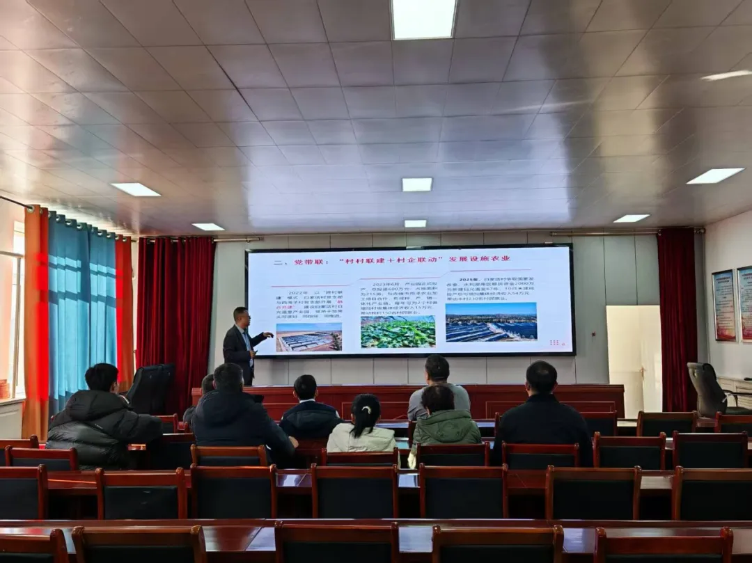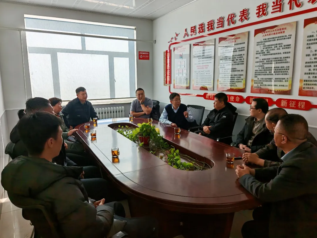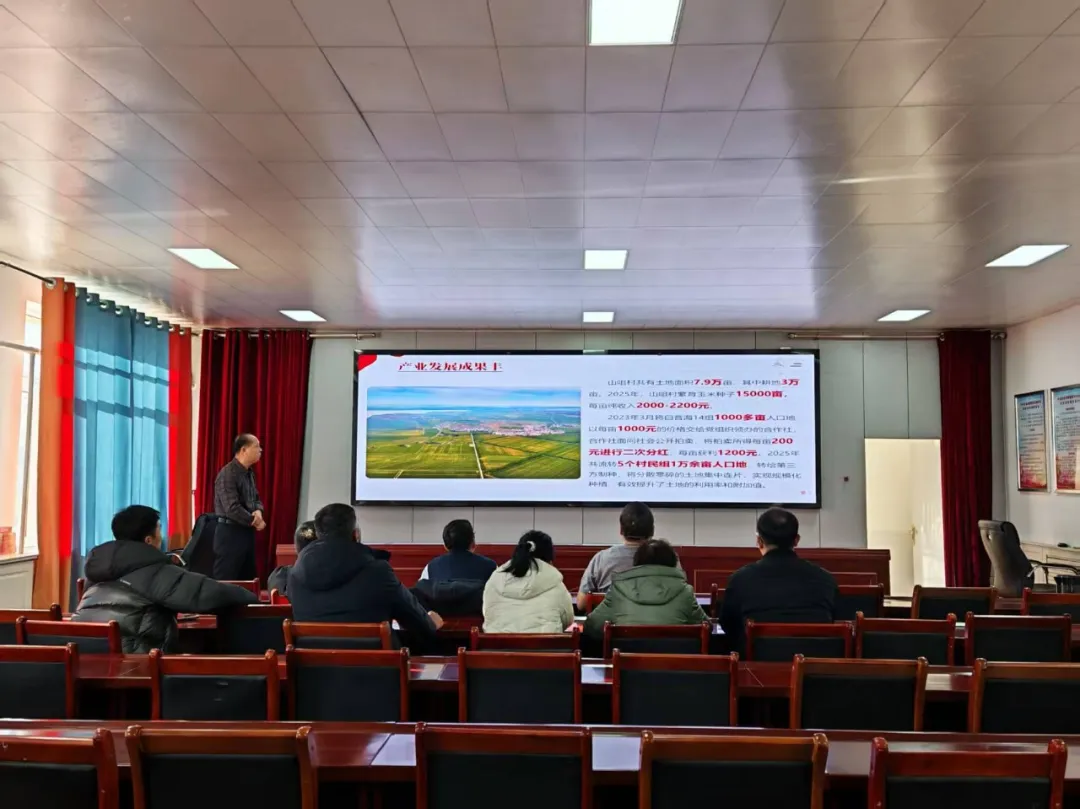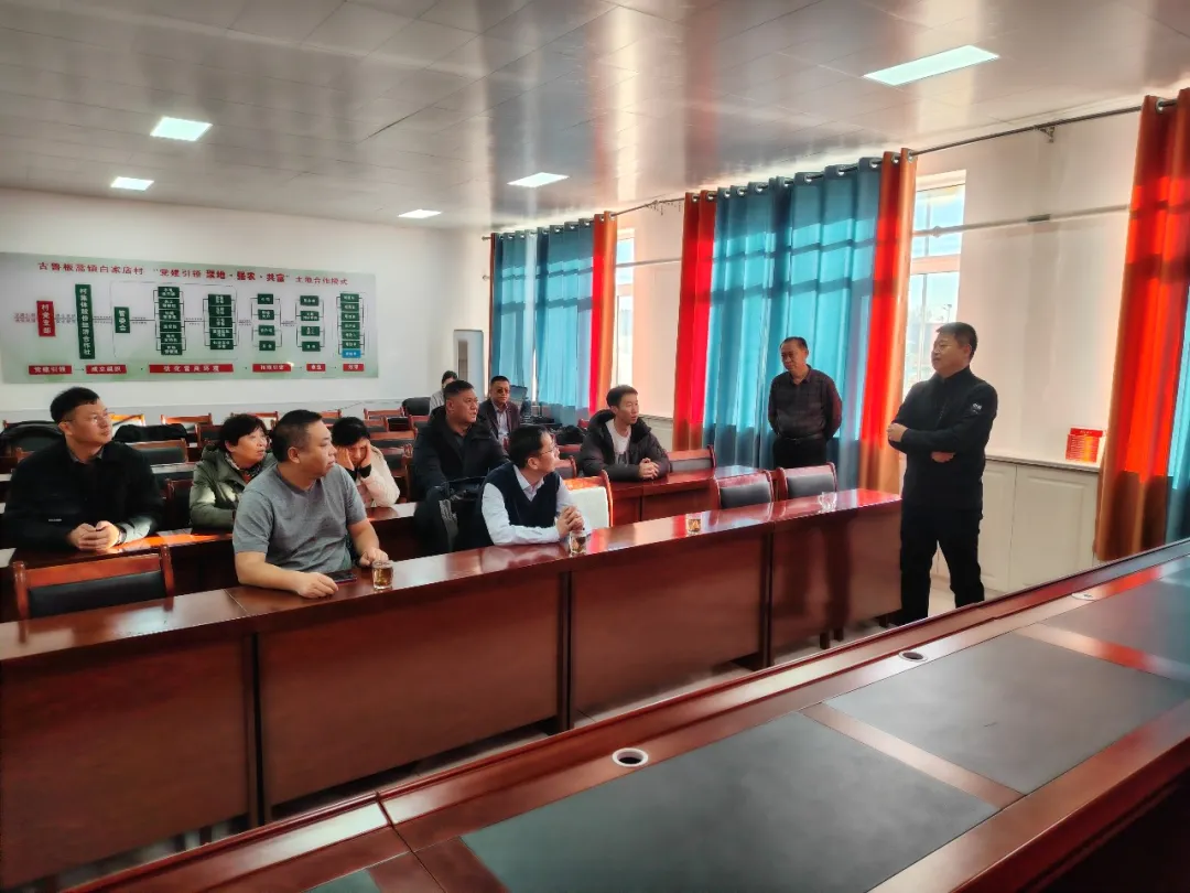 首先,古鲁板蒿镇党委书记左志光就全镇产业发展和土地流转情况作了简要介绍。随后,考察团观看了《山咀村党建引领促进乡村全面振兴》宣传片,山咀村党组织书记齐广玉围绕土地流转、产业结构调整及壮大村集体经济等方面进行了详细介绍。白家店村党组织书记崔立新以“党建引领 聚地·强农·共富”为主题,从发展背景、历程、效益和反哺惠民等角度汇报了白家店村在土地流转、产业调整及空心村整治方面的具体实践与成效。