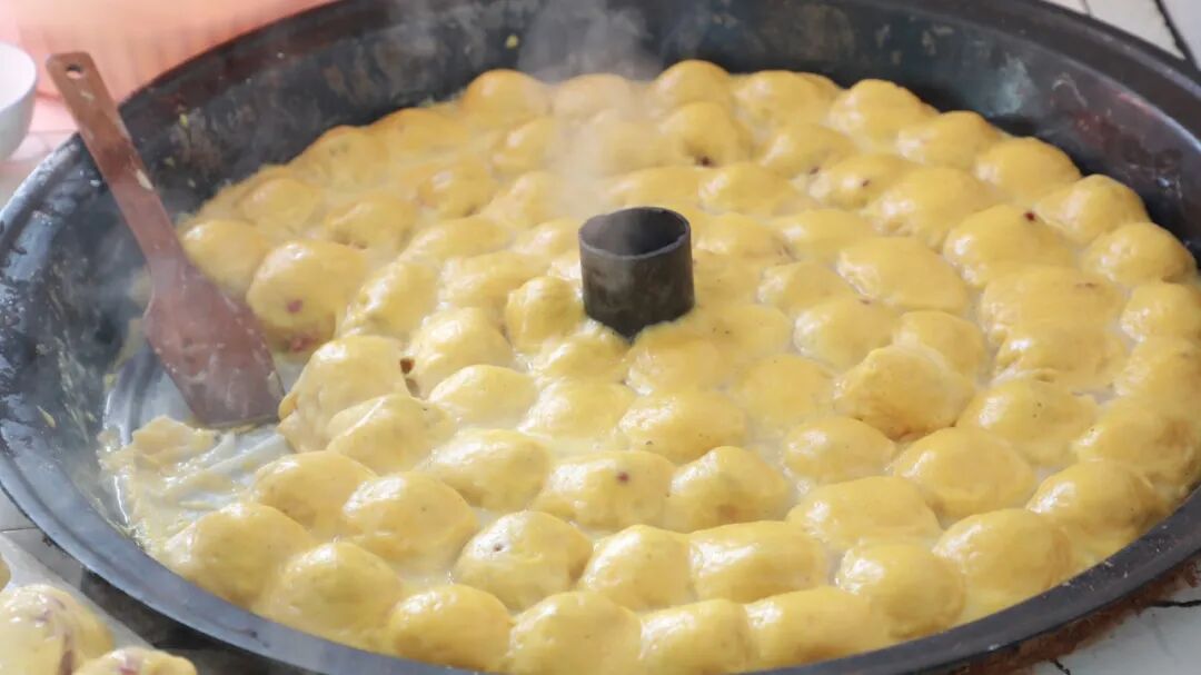 不一会,热气腾腾的粘豆包新鲜出炉,色泽金黄、轻轻咬上一口,软糯的外皮配上香甜的豆馅,作以自制的乡村小菜,真是叫人胃口大开。