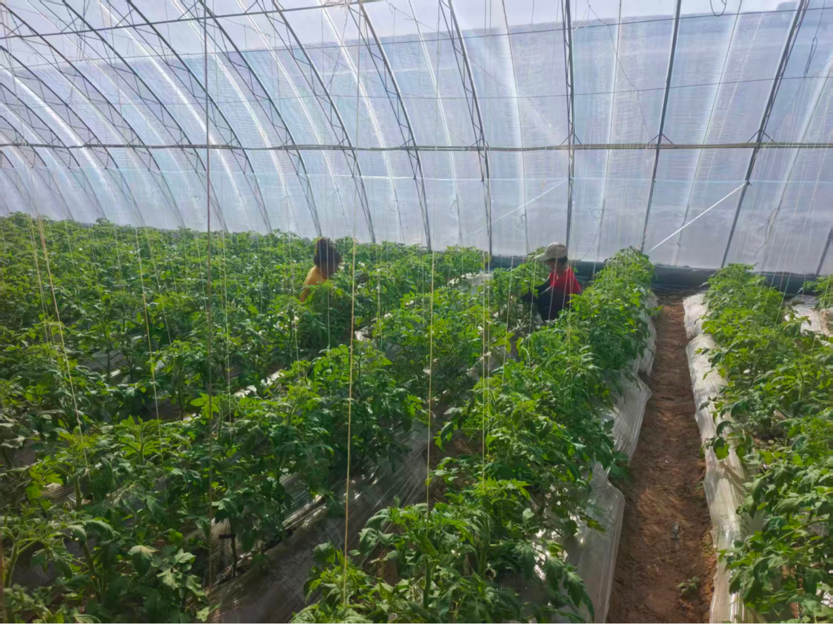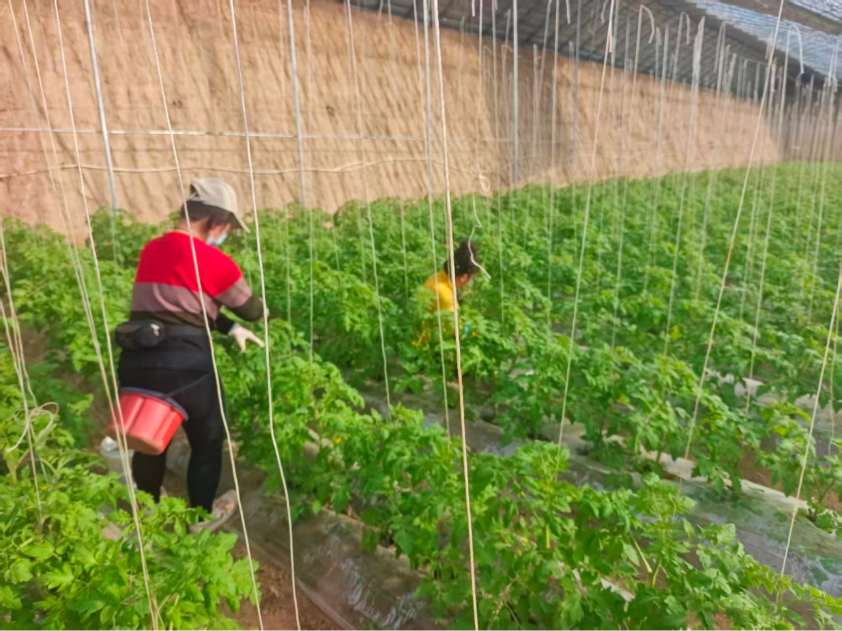 在暖棚内,工人们正忙着打岔、喷花、冲肥,一派繁忙的劳作景象。大家分工协作、精细管理,确保每一株西红柿都能得到充足的养分和良好的生长环境。在这里务工的村民王大姐一边忙碌一边说:“在家门口就能有稳定收入,还能学到种植技术,日子越来越有奔头。”