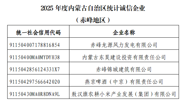 为强化统计领域信用建设,推动实现统计违法反面警示与诚信统计正向激励并重,持续营造依法统计依法治统的良好统计生态,赤峰市统计局积极组织辖区企业参与全区统计诚信企业评选工作。经自治区统计局审核认定,我市5家企业被评选为2025年度“内蒙古自治区统计诚信企业”。