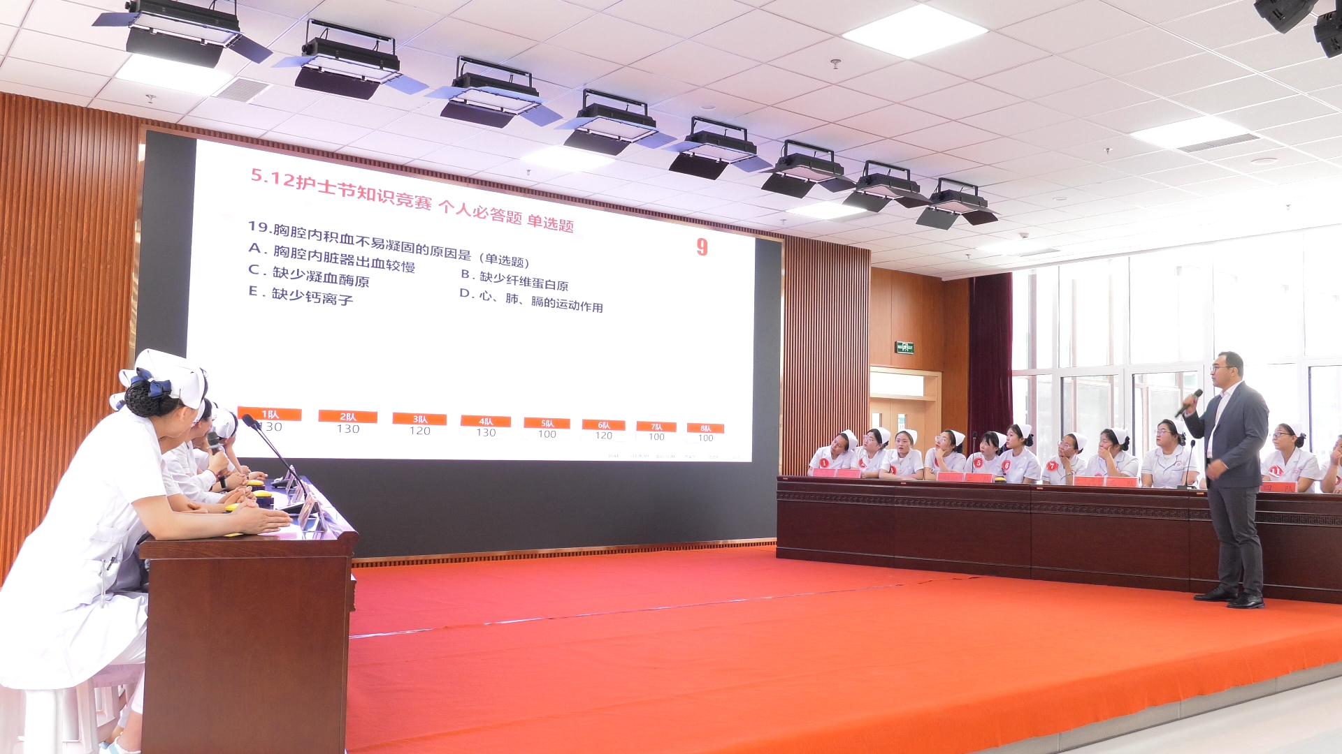 经过前期预赛的层层选拔,共有8家医疗机构挺进决赛。此次竞赛分理论知识和操作技能两部分,重点考查参赛选手护理知识的掌握、团队协作精神和人文素养。在知识竞赛过程中,参赛人员精神饱满、斗志昂扬,面对提问沉着冷静、反应迅速、配合默契、各展风采。在抢答环节,各个队伍互不示弱,快速思考、激烈抢答,将比赛一次次推向高潮。