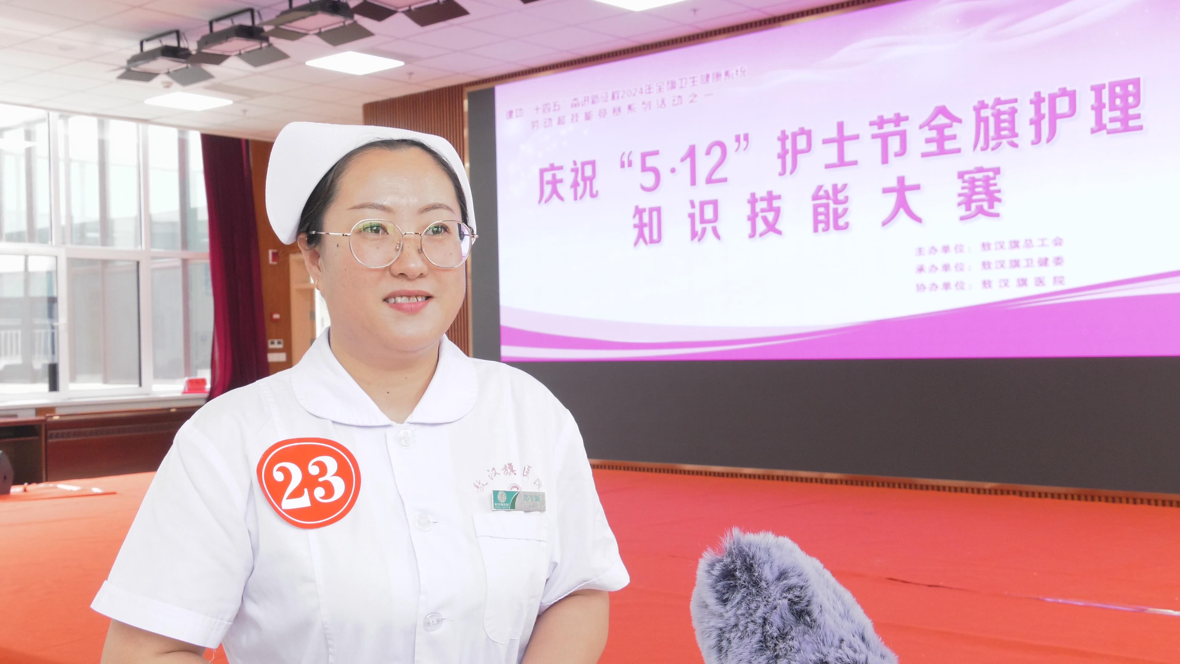 旗医院护士 邵学颖:参加这次团体比赛,我们做了大量的准备,尤其在这次比赛中,我们收获了许多知识,提升了我们的业务技能,对我的职业生涯很有帮助,我觉得这次护士节过得非常有意义。