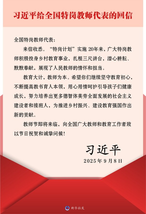 在第四十一个教师节来临之际,中共中央总书记、国家主席、中央军委主席习近平给全国特岗教师代表回信,提出殷切希望,并向全国广大教师和教育工作者致以节日祝贺和诚挚问候。