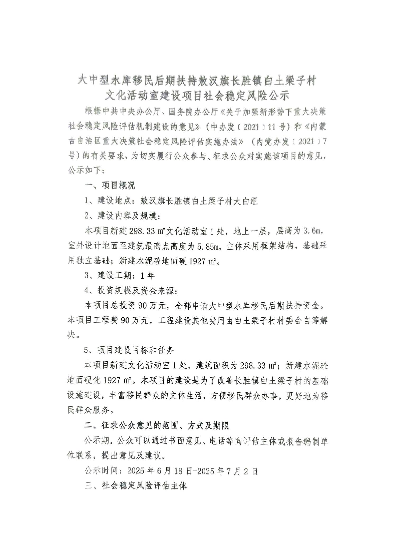 大中型水库移民后期扶持敖汉旗长胜镇白土梁子村文化活动室建设项目社会稳定风险公示