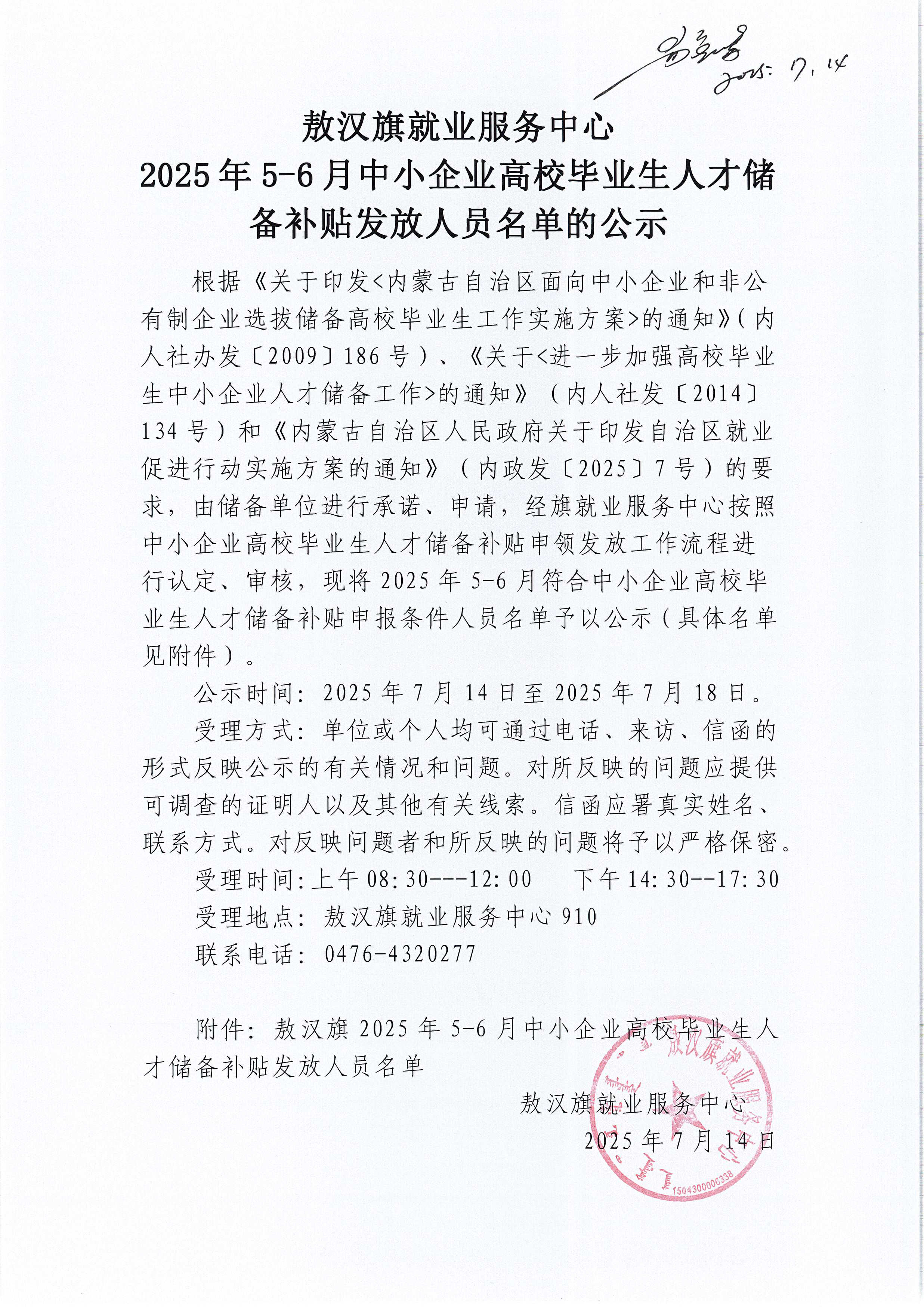 敖汉旗就业服务中心2025年5-6月中小企业高校毕业生人才储备补贴发放人员名单的公示