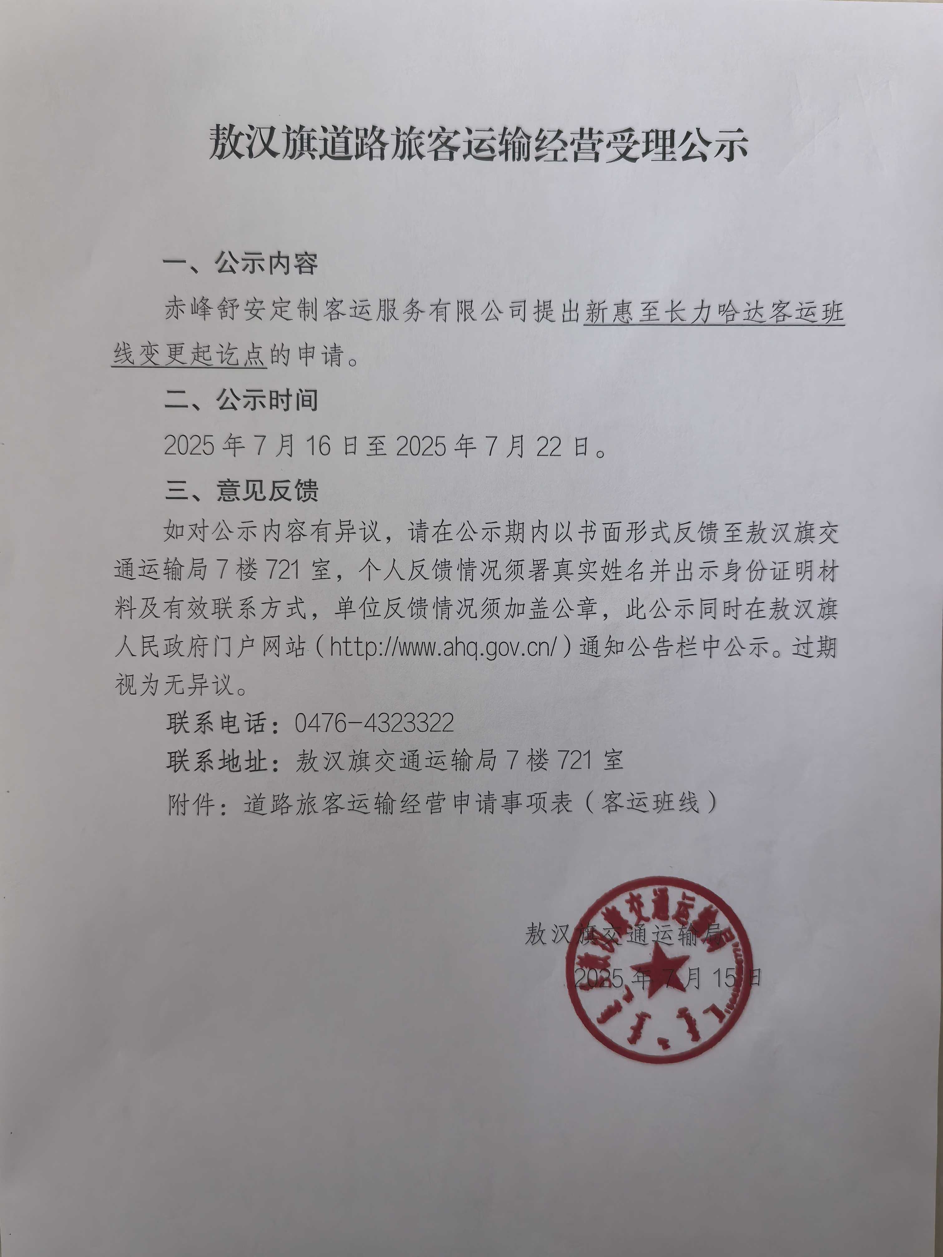 敖汉旗道路旅客运输经营受理公示