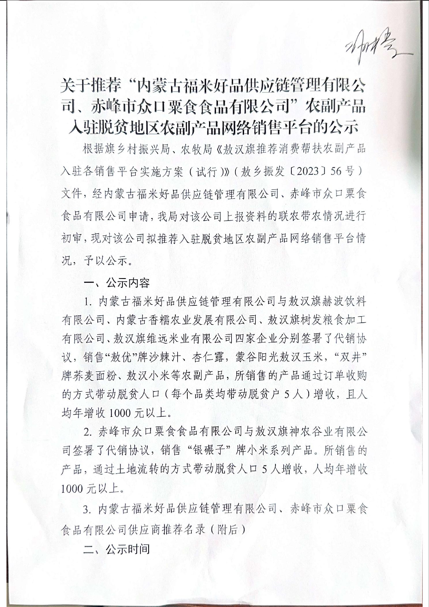 关于推荐“内蒙古福米好品供应链管理有限公司、赤峰市众口粟食食品有限公司”农副产品入驻脱贫地区农副产品网络销售平台的公示