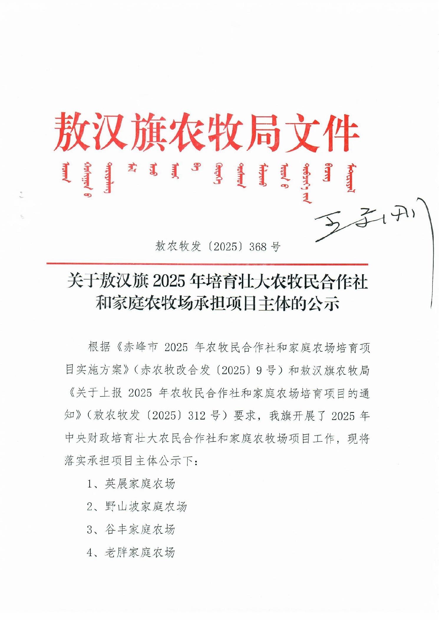 关于敖汉旗2025年培育壮大农牧民合作社和家庭农牧场承担项目主体的公示