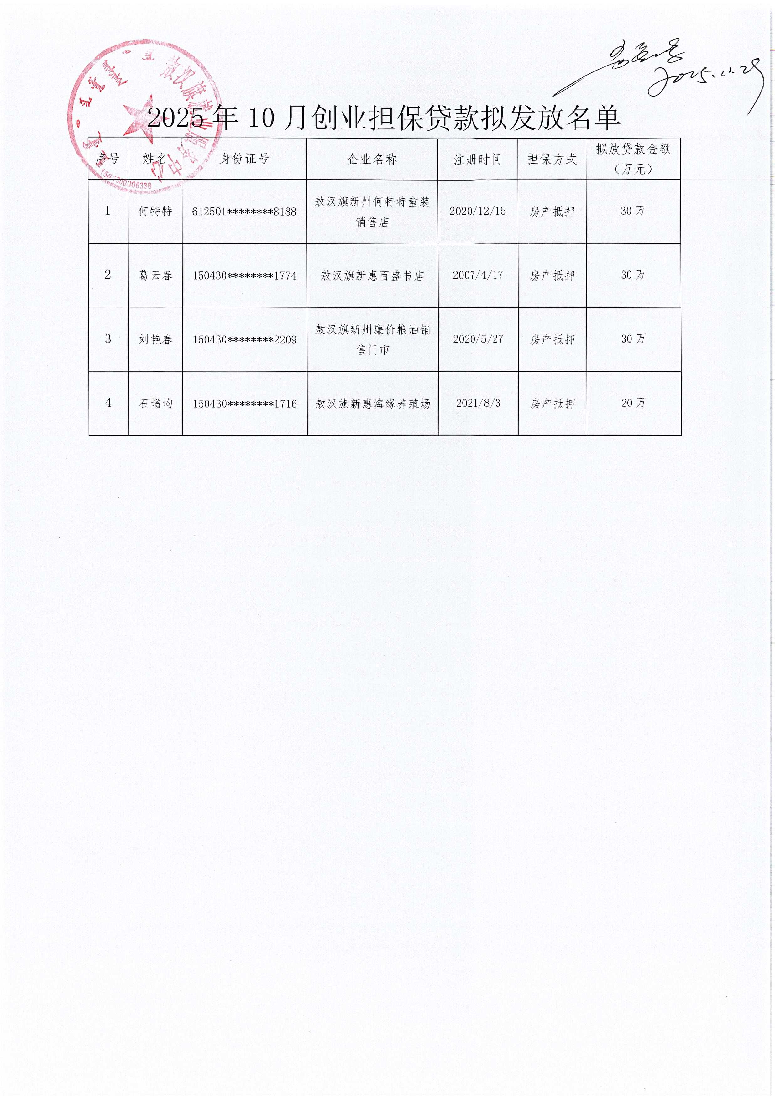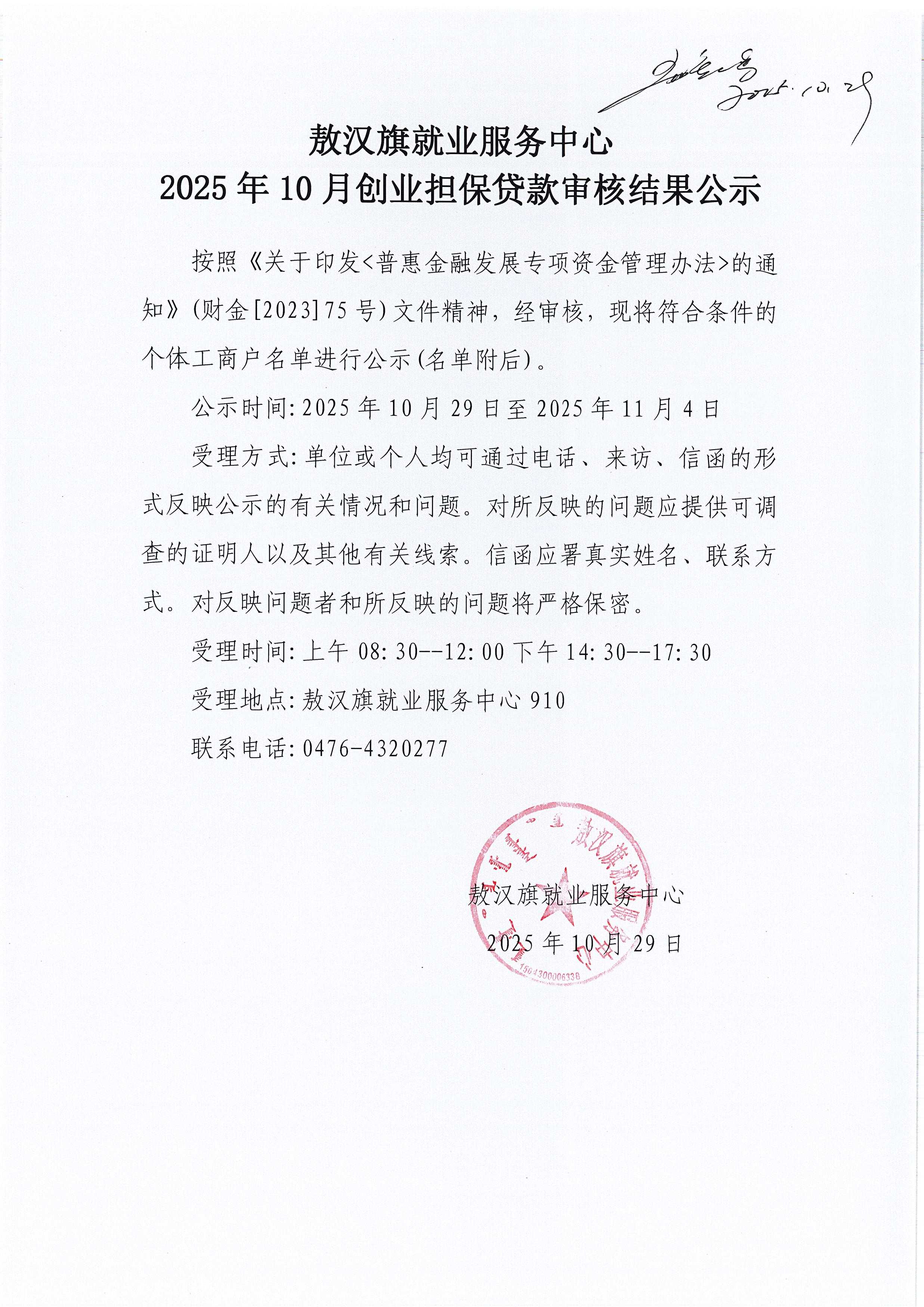 敖汉旗就业服务中心2025年10月创业担保贷款审核结果公示