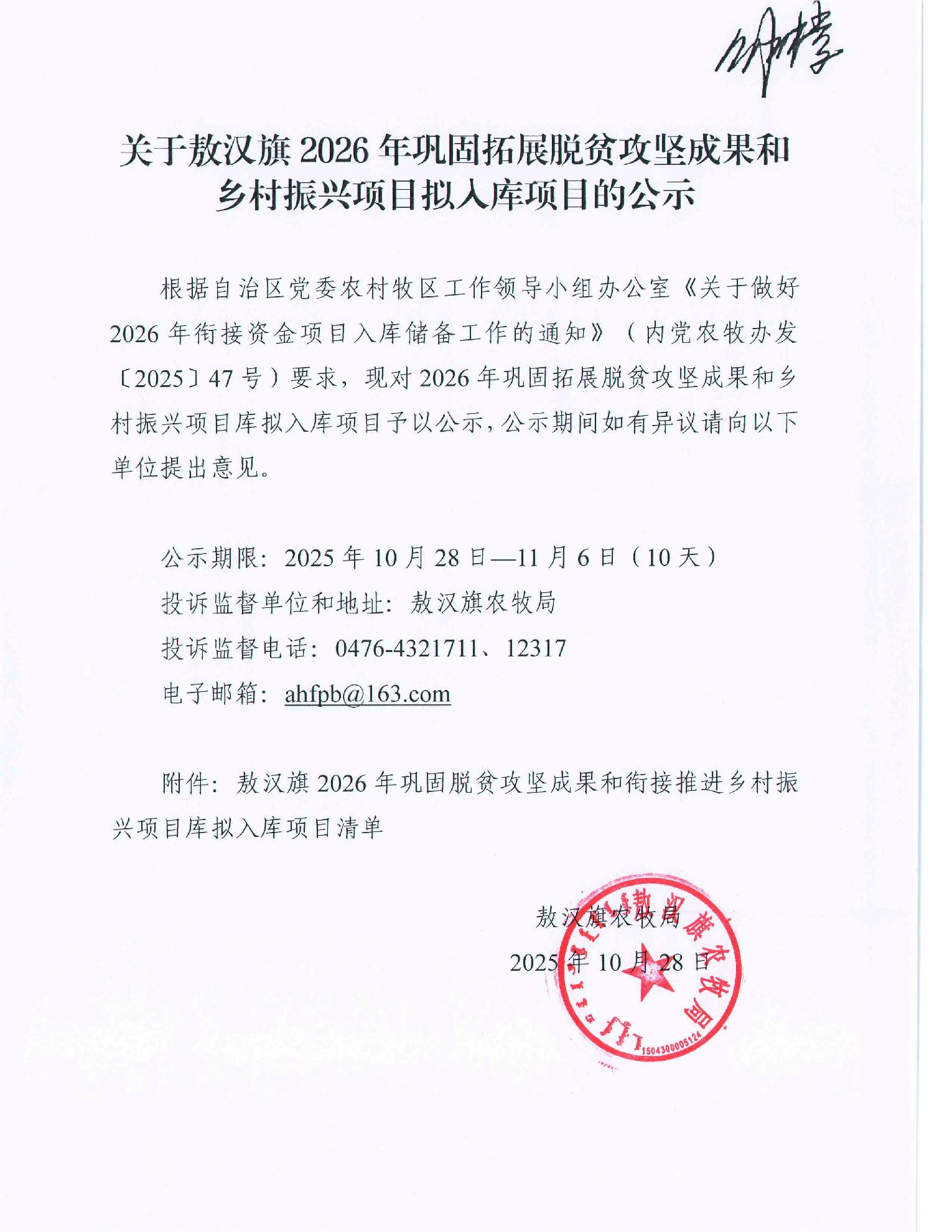 关于敖汉旗2026年巩固拓展脱贫攻坚成果和乡村振兴项目拟入库项目的公示