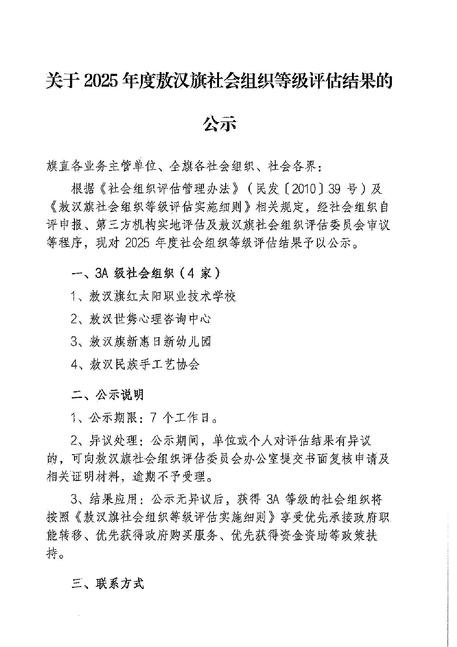 关于2025年度敖汉旗社会组织等级评估结果的公示