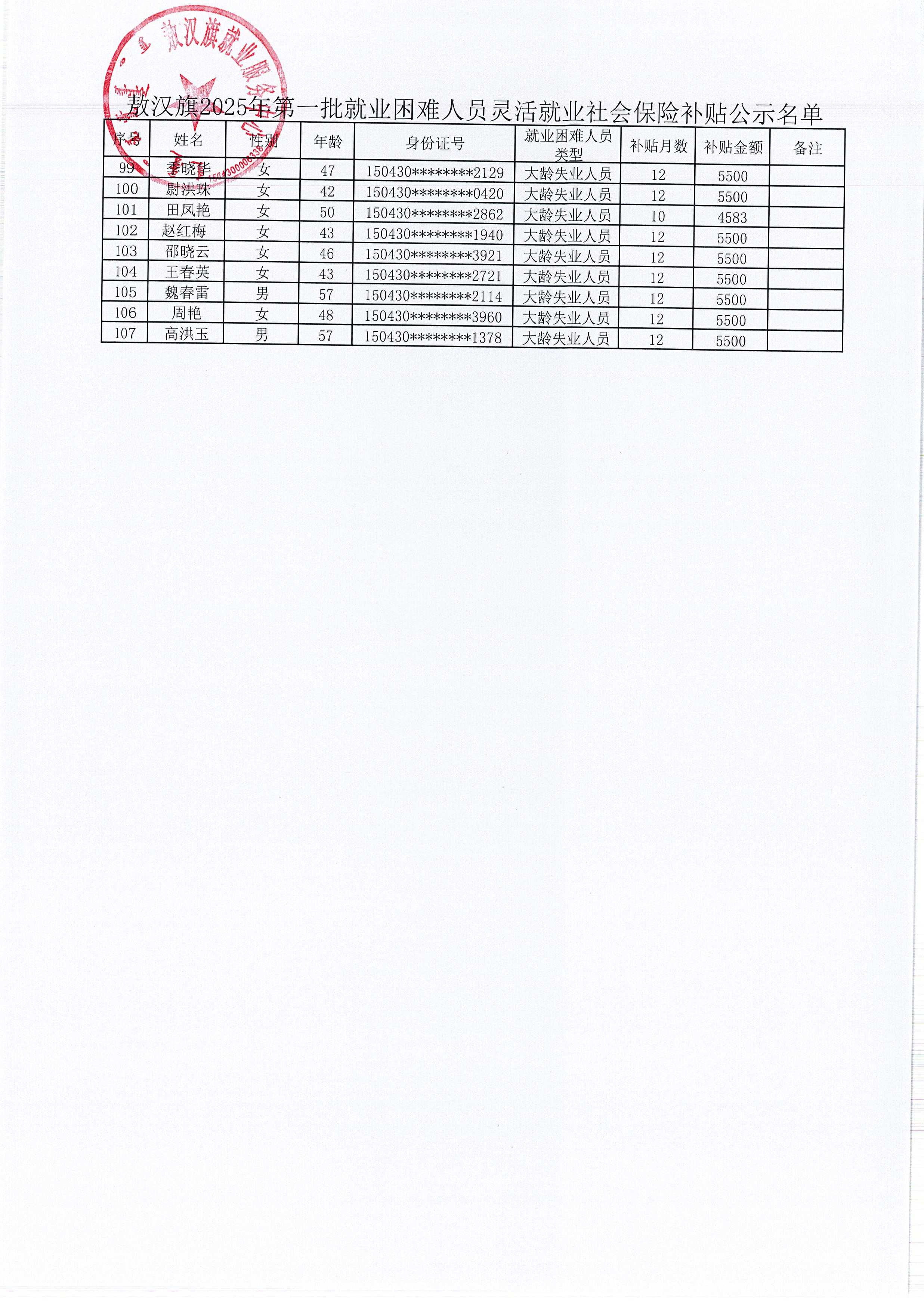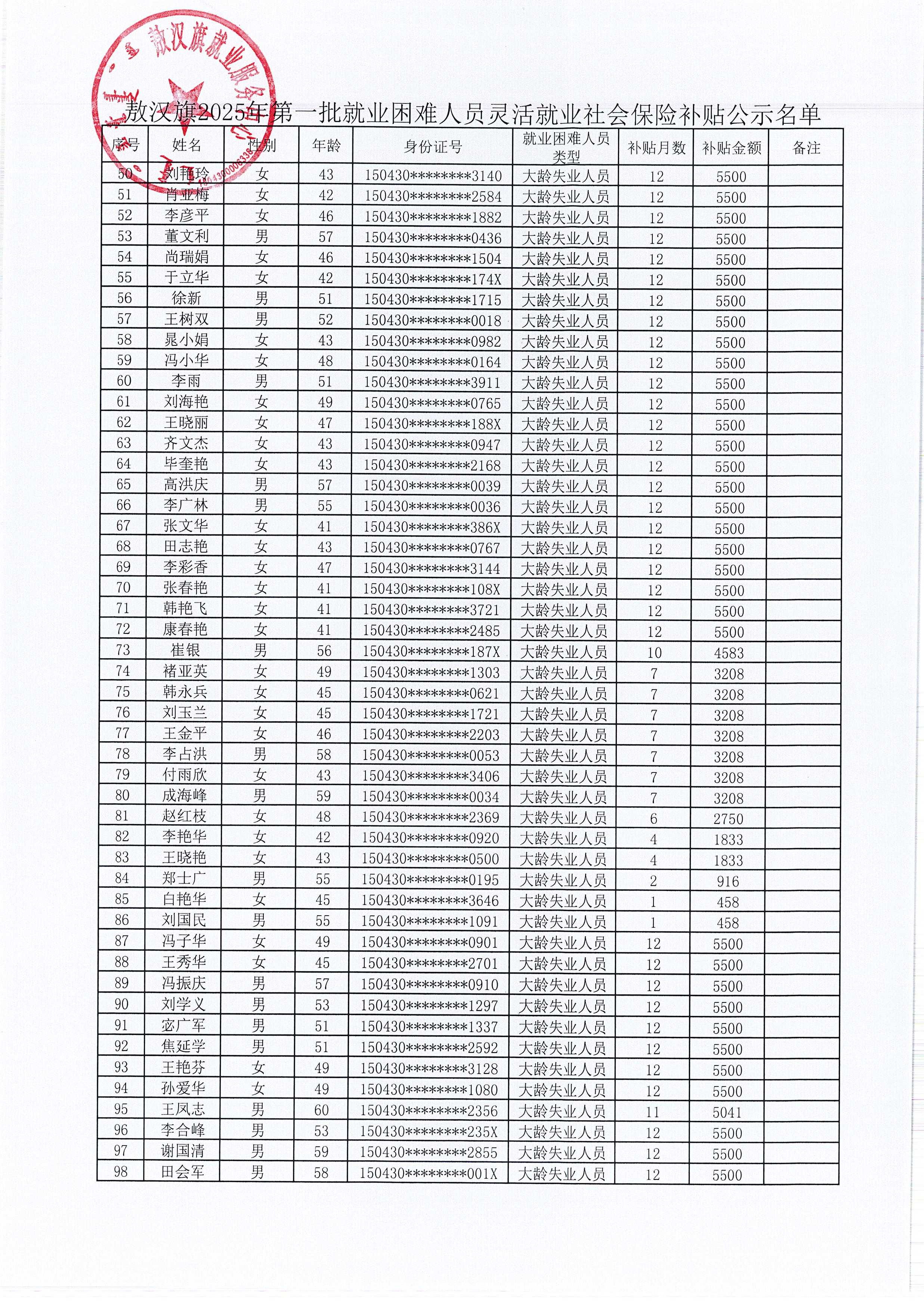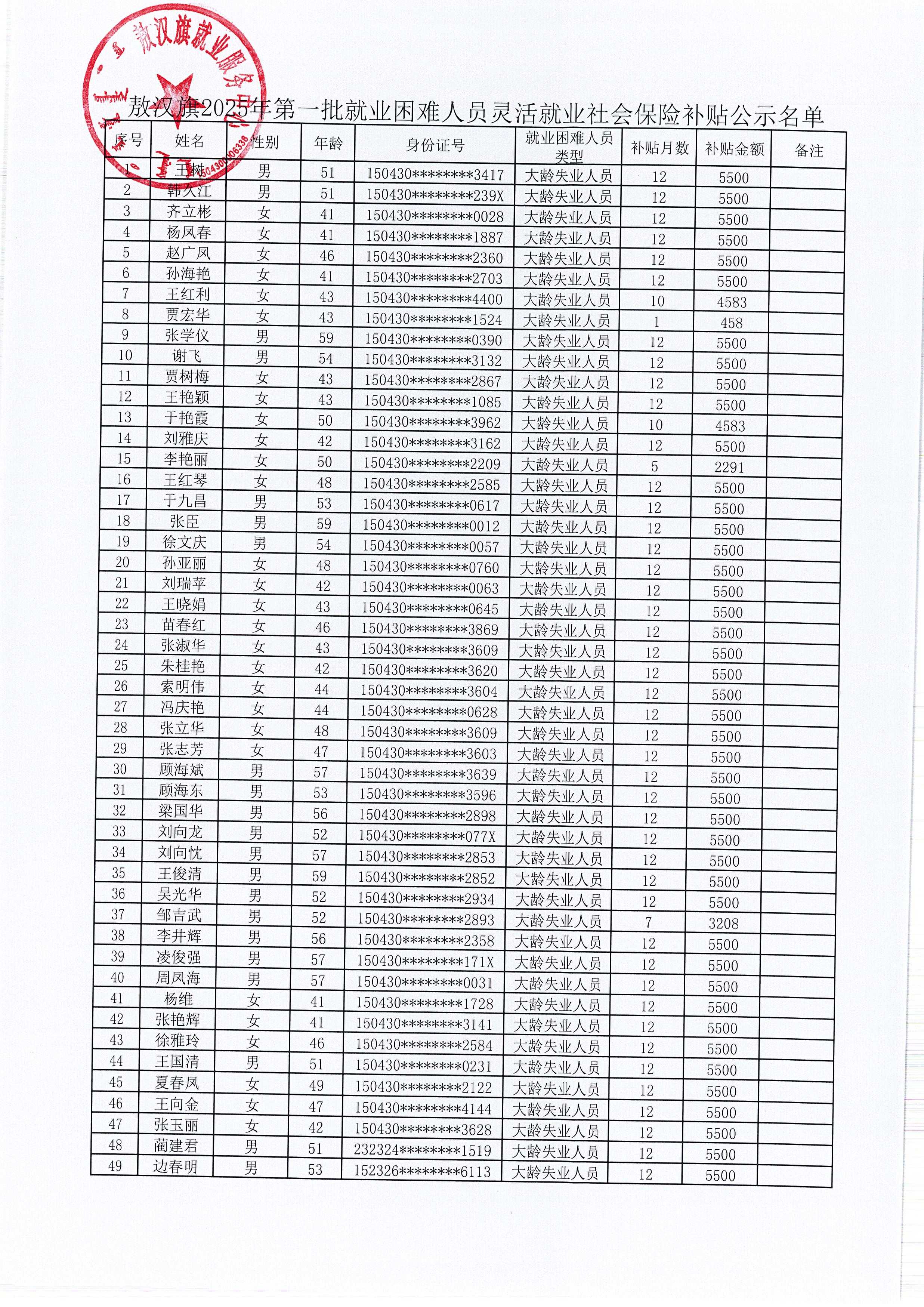 敖汉旗2025年第一批就业困难人员灵活就业社会保险补贴公示