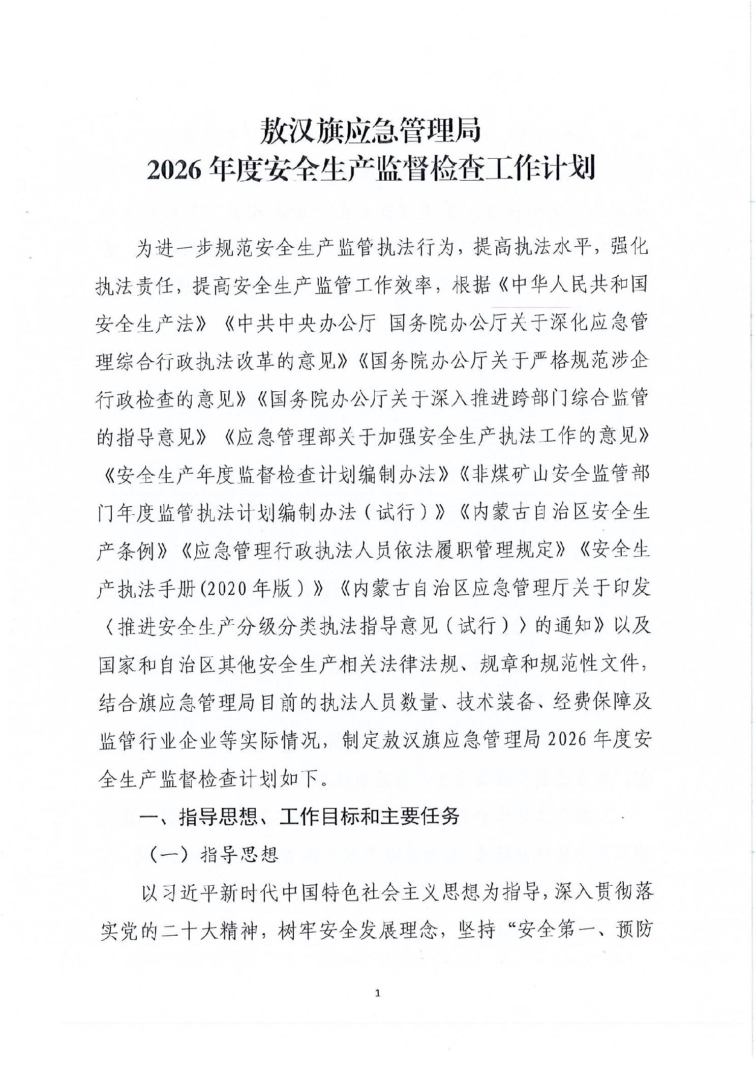 关于印发《敖汉旗应急管理局2026年度安全生产监督检查工作计划》的通知