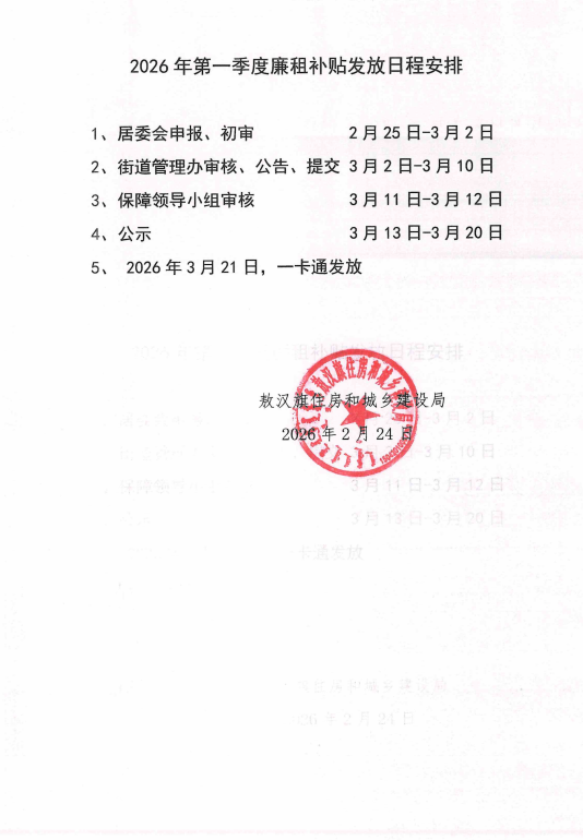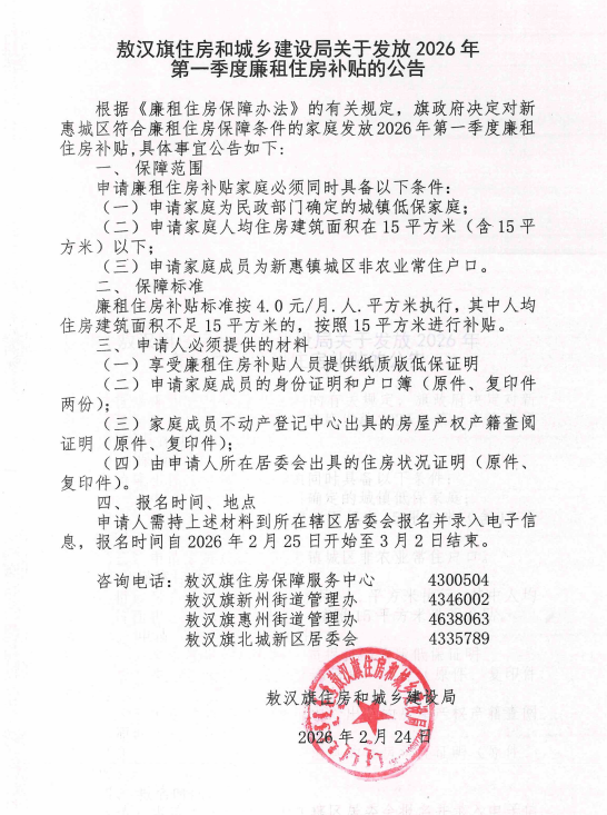 敖汉旗住房和城乡建设局关于发放2026年第一季度廉租住房补贴的公告