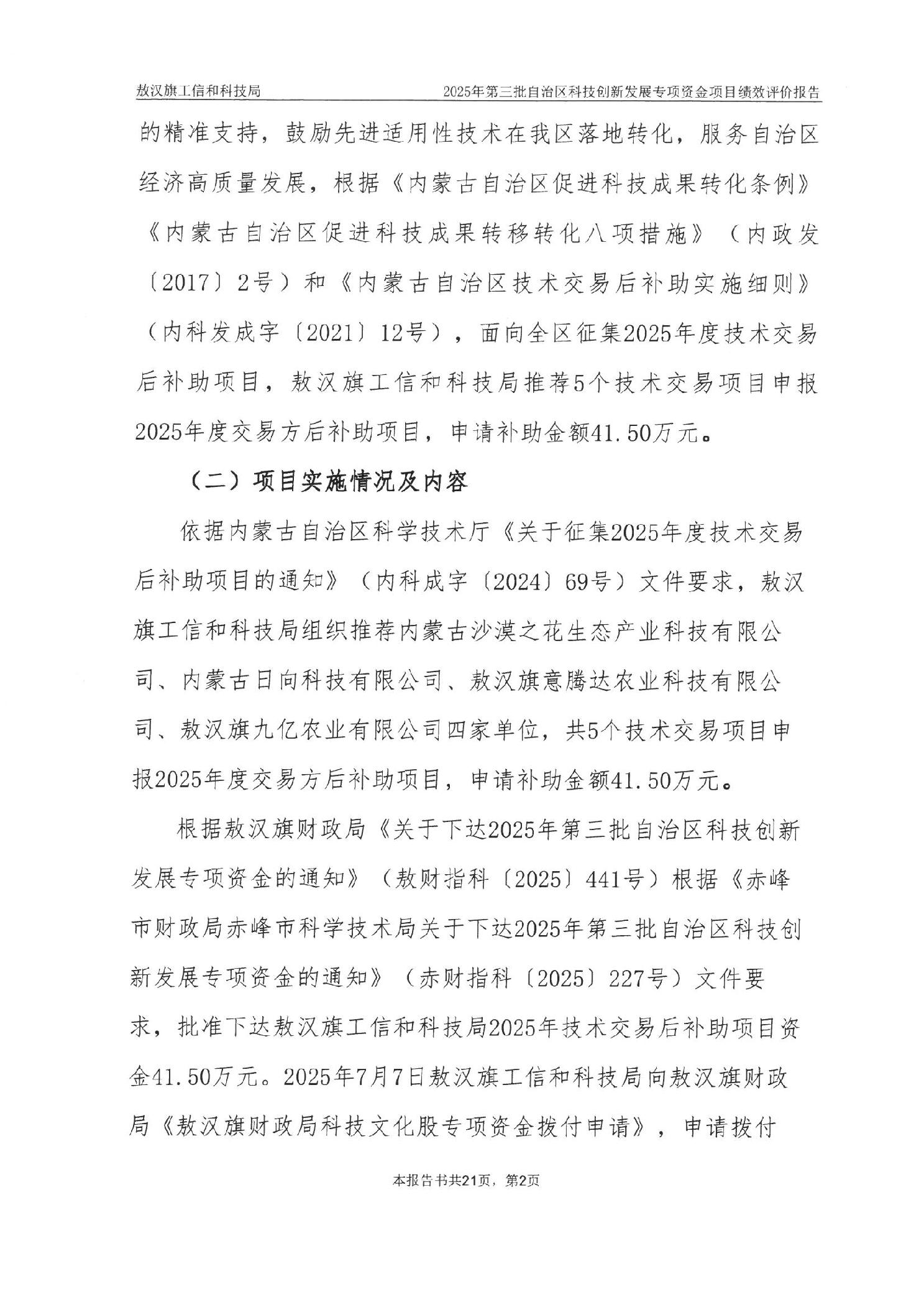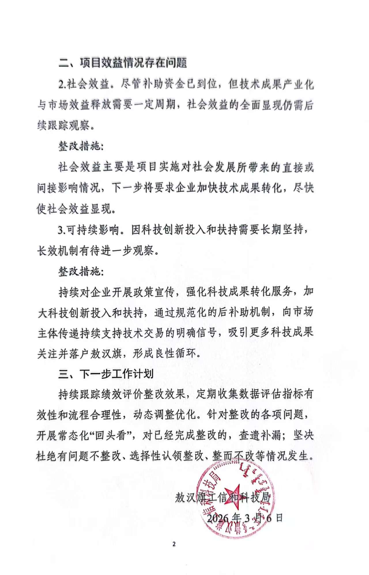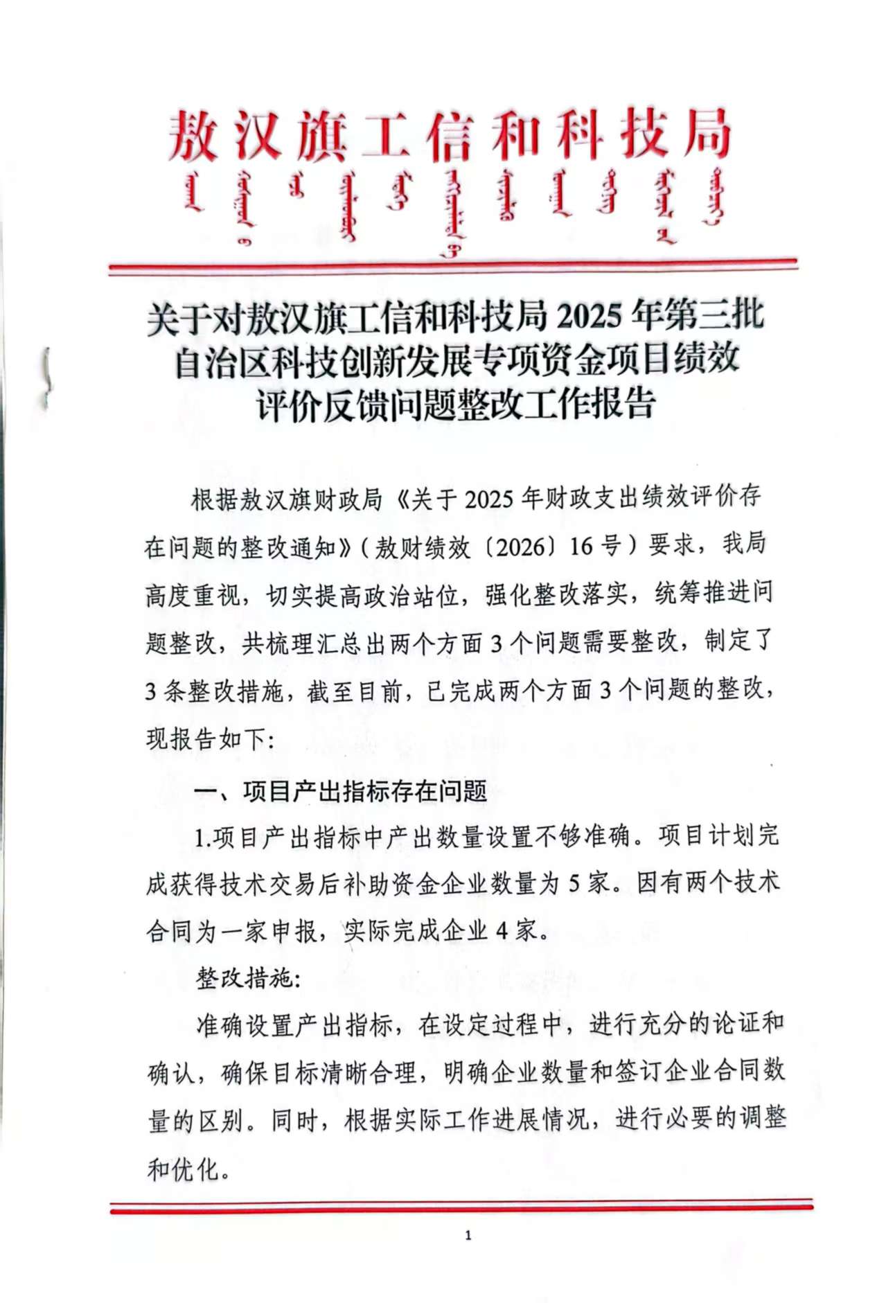 关于对敖汉旗工信和科技局2025年第三批自治区科技创新发展专项资金项目绩效评价反馈问题整改工作报告