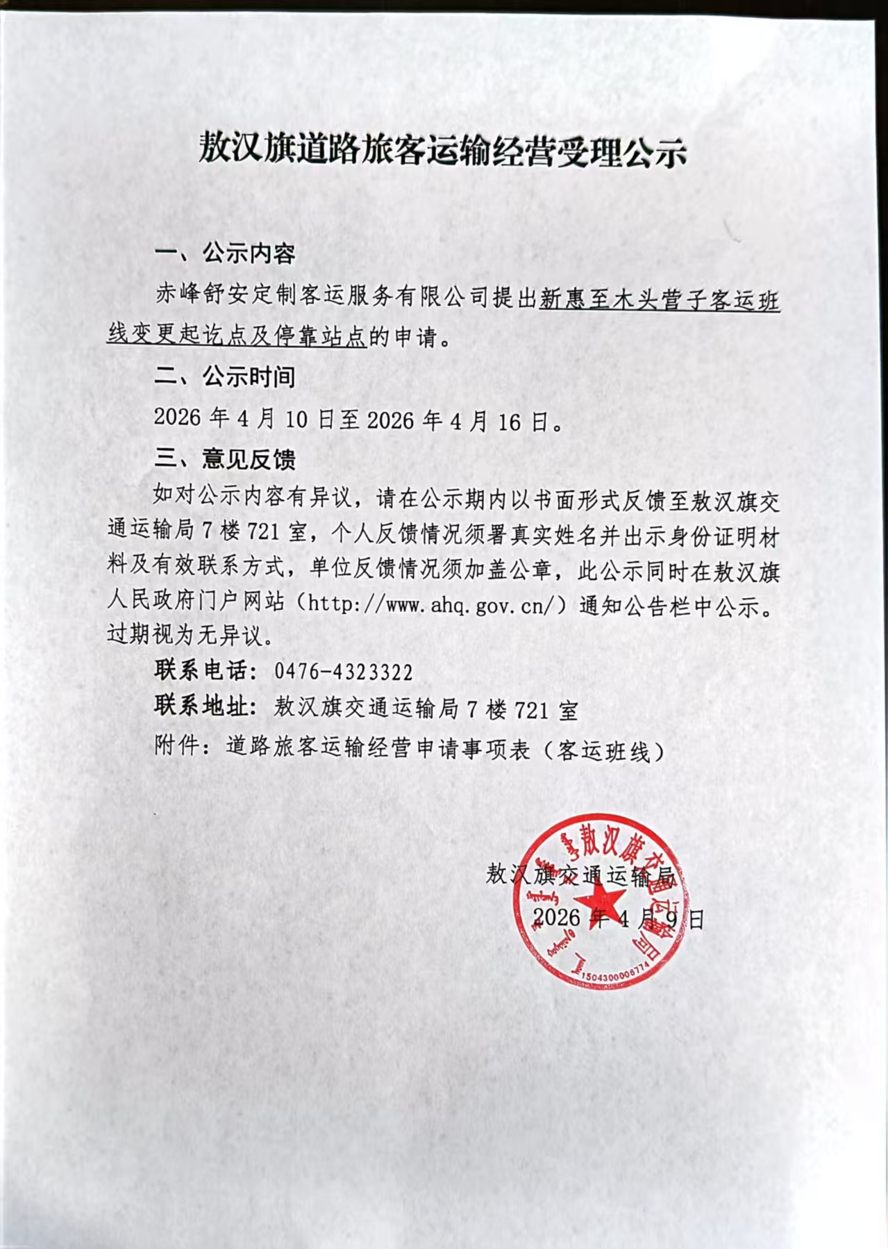 敖汉旗道路旅客运输经营受理公示