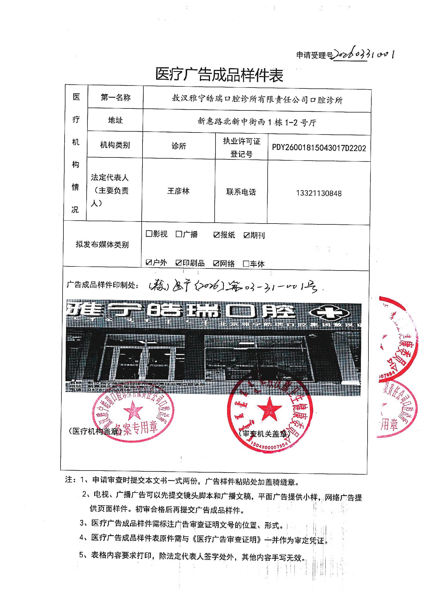 医疗广告审查证明及成品样件(雅宁皓瑞口腔诊所)